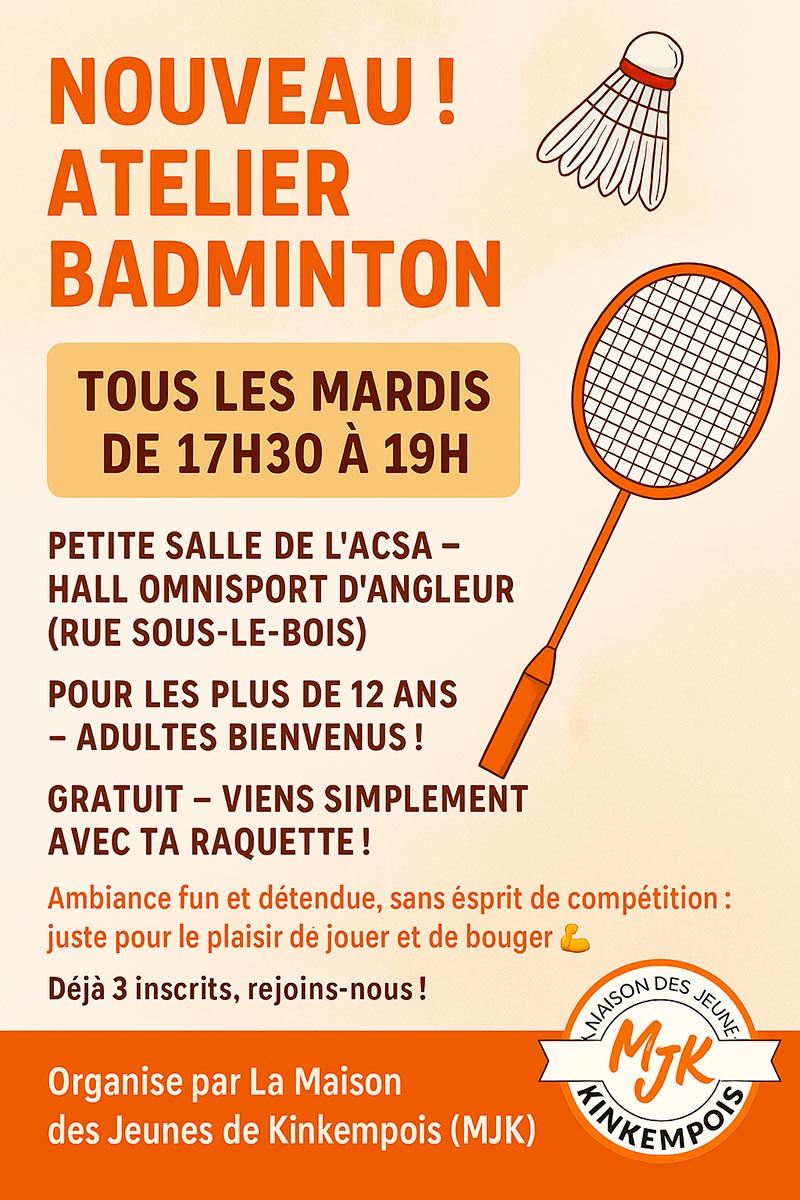 Alors rejoins-nous au nouvel atelier BADMINTON organisé par la Maison des Jeunes de Kinkempois ! 🏸✨